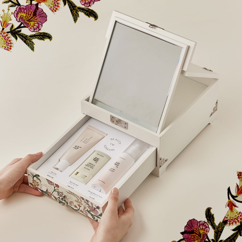 Elevate your skincare routine with our exclusive Sun Trio Kit. All three of our sunscreen products are encased in a beautifully designed traditional Korean vanity called ‘kyungdae.’ This vanity is exquisitely crafted to visualize the essence of the beauty philosophy of the Joseon Dynasty. This exclusive vanity features intricate designs and a foldable mirror on top, making it a truly special keepsake.